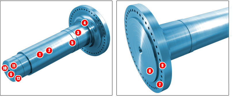 通常、風力タービンのローター軸は熱処理された 鍛鋼部材となります。ローター軸は、ハブからの 低速回転を増速機に伝達し、増速機で回転を UPさせます。その後、発電機を高速回転させる ことにより、電気エネルギーを生み出します。